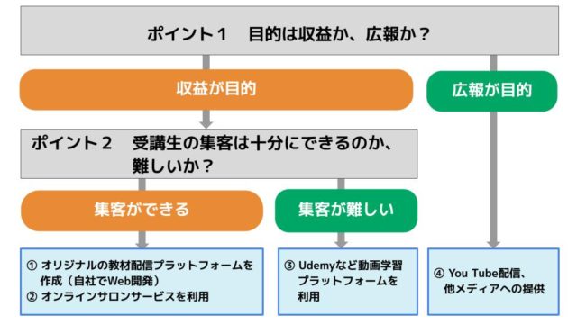 - 動画教材を使った教育サービス開発時のシステムの選び方。目的と集客力に応じて選びたい利用プラットフォーム(自社/オンラインサロン/Udemy・YouTube他)