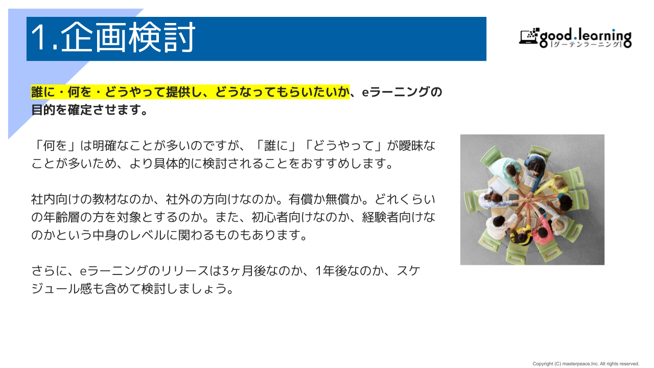 そのため、教材を製作する段階で、費用がかさんだり、納期がずれこんだりということは、よくある話です。そのため、企画サービスの設計段階から、教材準備にとりかかりることをおすすめします。サービス設計と教材準備を並行して行うことで、工数の見直しなどができることもあります。また教材を準備していくうえで、ユーザーにフォローするポイントなどが見えてくることがあります。