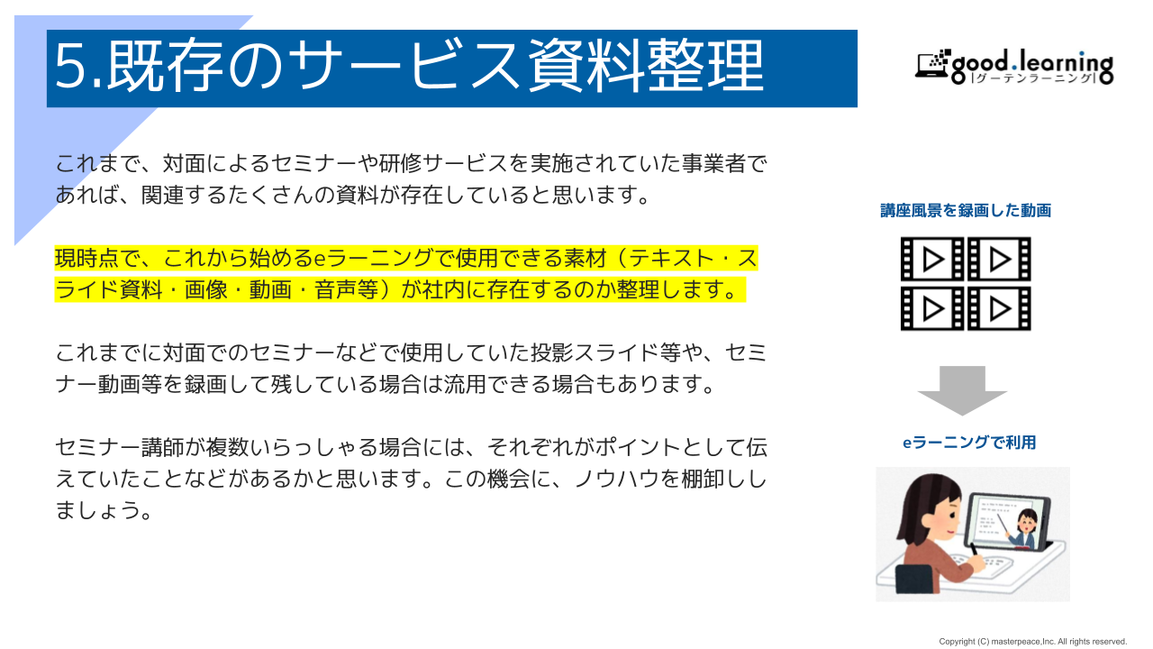使用していた投影スライド等や、セミナー動画等を録画して残している場合は、流用できる場合もあります。また、セミナー講師が複数いらっしゃる場合には、講師それぞれがポイントとして伝えていたことなどがあるかと思います。この機会に、それぞれのノウハウを棚卸して、教材としてまとめることをお勧めします。