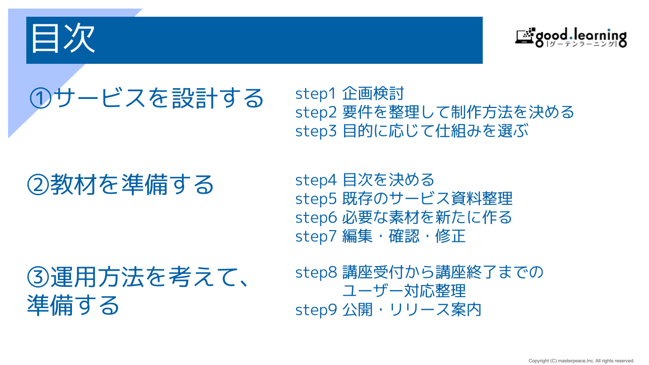 この資料では、教材準備で起こりがちな手戻りのリスクを減らすポイントなど、サービス企画から講座運用まで、3つのプロセスについてご紹介いたします。
