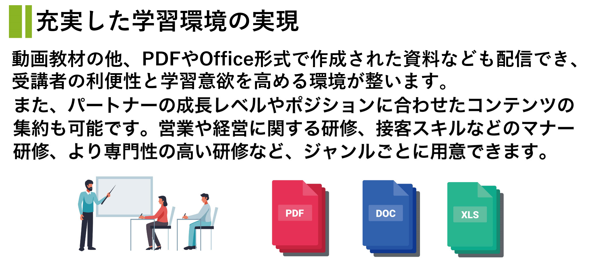 どのパートナーに対しても同じ価値を提供することが理想ではありますが、対面研修では提供内容の「質」はどうしても担当者に依存しがちです。しかし、研修内容をコンテンツ化してまとめることで、質のバラつきをなくし、クオリティを担保することができます。