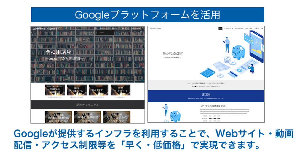 ■Google Workspace(G Suite)を導入済であれば、追加インフラコストがかからず、eラーニングサイトをスピーディーに立ち上げられる