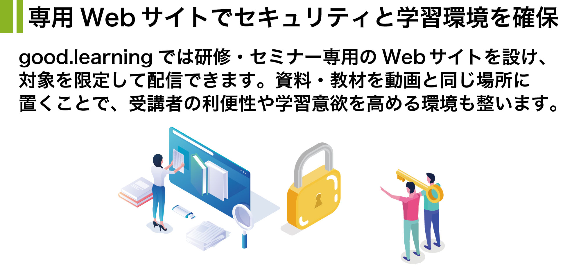 Googleプラットフォームを活用することで、安全に社内の教育サイトを充実させて、社内向け研修や資格取得セミナー等をオンライン化できます。 新たなアカウントをご用意いただく必要はなく、新しいID・パスワードを覚える必要もなく、セキュリティリスクが高まる心配はありません。