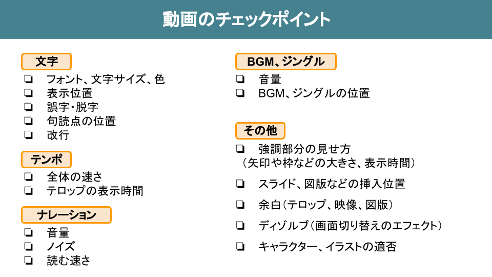 動画の内容によってチェックポイントは異なりますが、主に以下のような項目が必要となります。