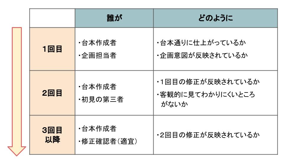 最終段階に近づくにつれて確認の回数は少なくなり、間違いを見落としやすくなります。3回目以降でも修正が多い場合は、別の人にダブルチェックしてもらうと良いでしょう。