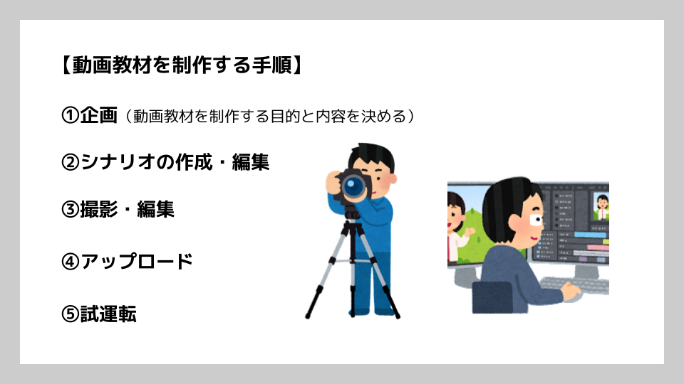次項から、動画教材の制作手順やポイントなどを詳しく見ていきましょう。