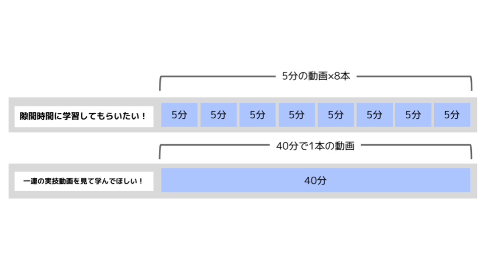 例えば、隙間時間で学習してもらいたい場合は、学習内容を区切って短時間の動画を用意するとよいでしょう。一方で、一連の動画を視聴してもらいたい場合など、短時間の動画が適さないこともあります。