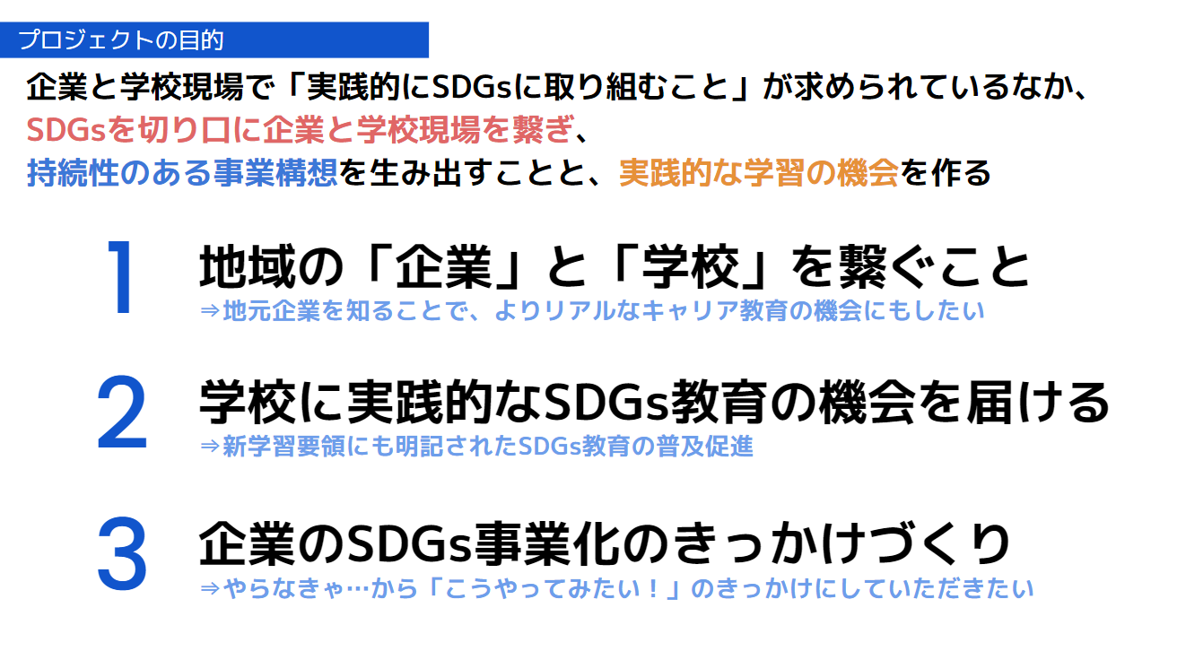 SDGsに取り組みたい企業と「SDGs達成の担い手育成」教育を進める学校現場を繋ぎ、持続性のある事業構想を生み出すことと、実践的な学習の機会を作ることをプロジェクトの目的にしております。