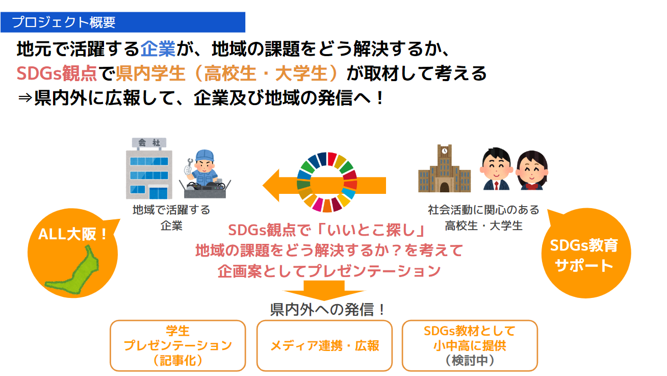 社会活動に関心のある近畿大学附属高等学校の学生(高校生・大学生)が、地元で活躍する企業を取材し、SDGsの観点で「いいとこ探し」をおこないます。