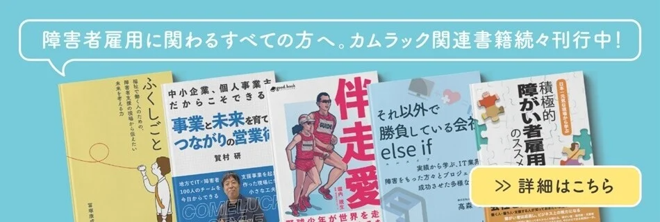 good.book サービスを通して『日本一元気な現場から学ぶ 積極的障がい者雇用のススメ』をはじめ、計6冊の本を出版されている株式会社カムラックさん。カムラックさんは、福岡県で、障がい者の就労支援事業を行っている会社です。ITを活用した仕事を通して障がいのある方が自立した生活を送れるような雇用の場を創っています。今回は、代表の賀村さんにお話を伺いました。
