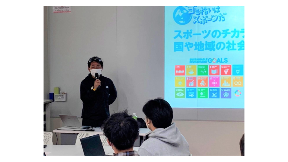 そこで私たちは、「スポーツ×ゴミ拾い(スポGOMI)」という斬新なアイデアを生み出し、スポGOMIを通じた環境保護活動に尽力している一般社団法人ソーシャルスポーツイニシアチブ代表理事の馬見塚健一さんを大学にお招きし、特別講義とインタビューを行いました。