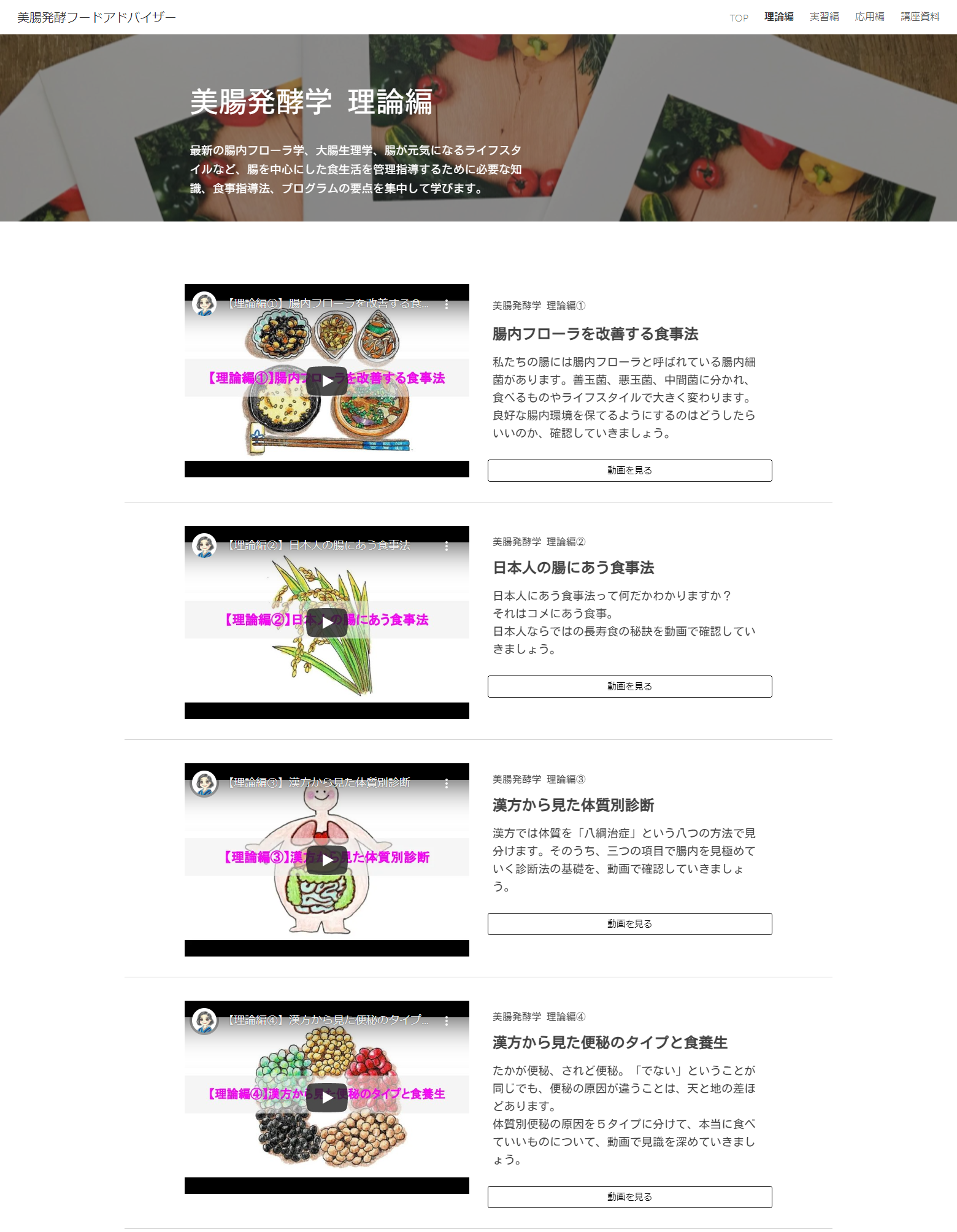 和食の基本である発酵食を中心とした腸活ライフを受講者自身が指導できるようになる事を目的として、腸内フローラや大腸生理学、漢方と薬膳の観点、発酵食品での腸活方法、発酵食品の作り方などを勉強する会員制eラーニングサービスです。