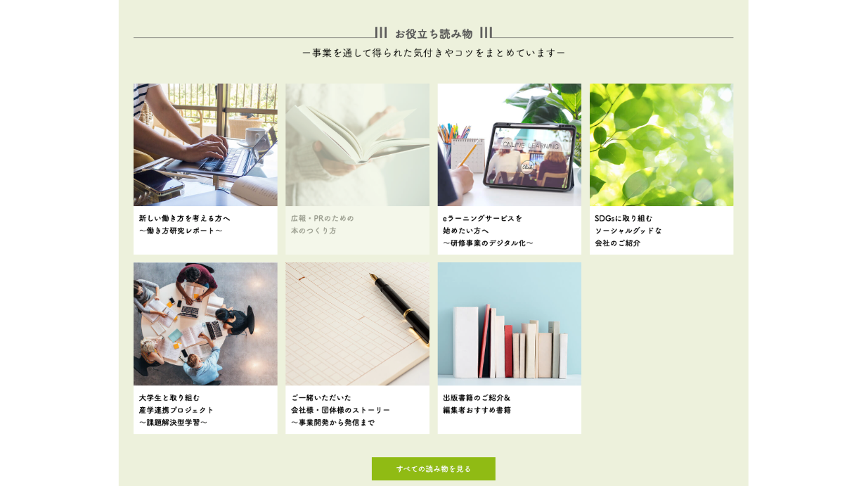 当社の発行書籍や、サービスの実績紹介など、くわしい情報へすぐにアクセスしていただけるよう、TOPページからのリンクを充実させました。