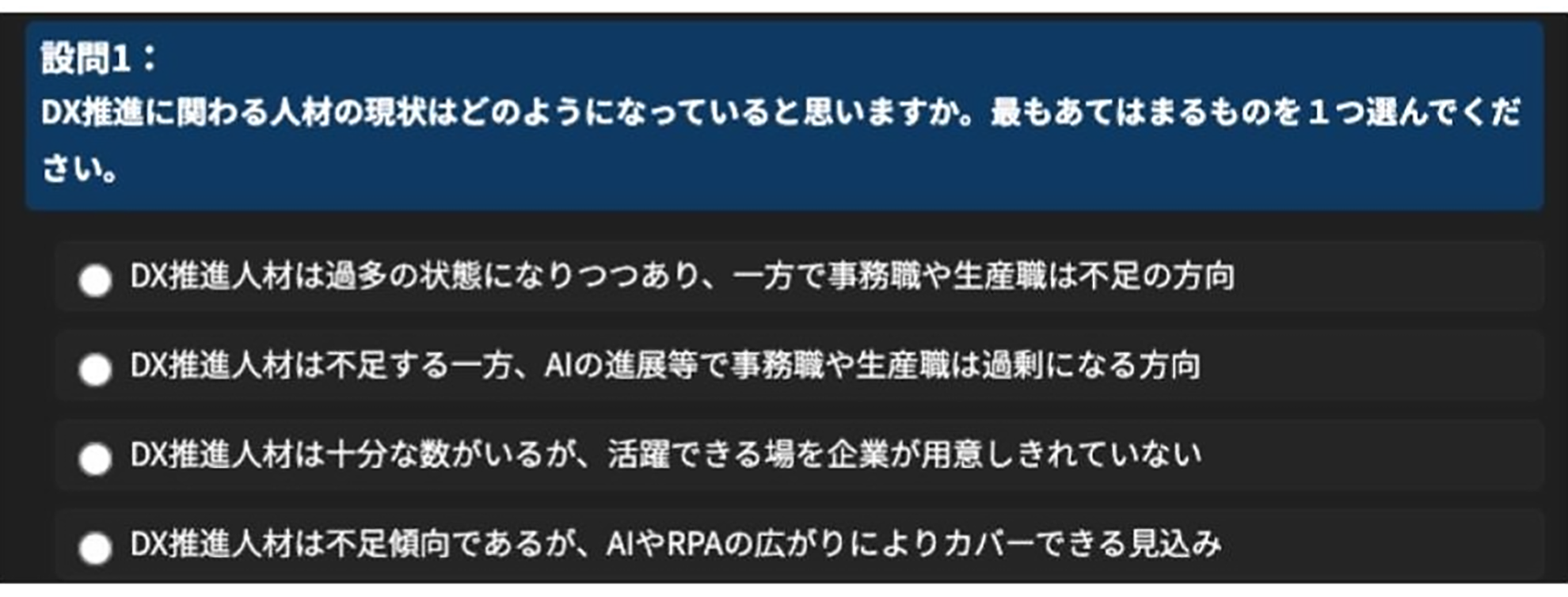 学習の到達度を測るための「理解度テスト」「修了テスト」は、前向きに取り組めるよう選択式の問題で構成しました。さらに修了テストでは、自身の業務へつなげるための問いかけも設問化しました。
