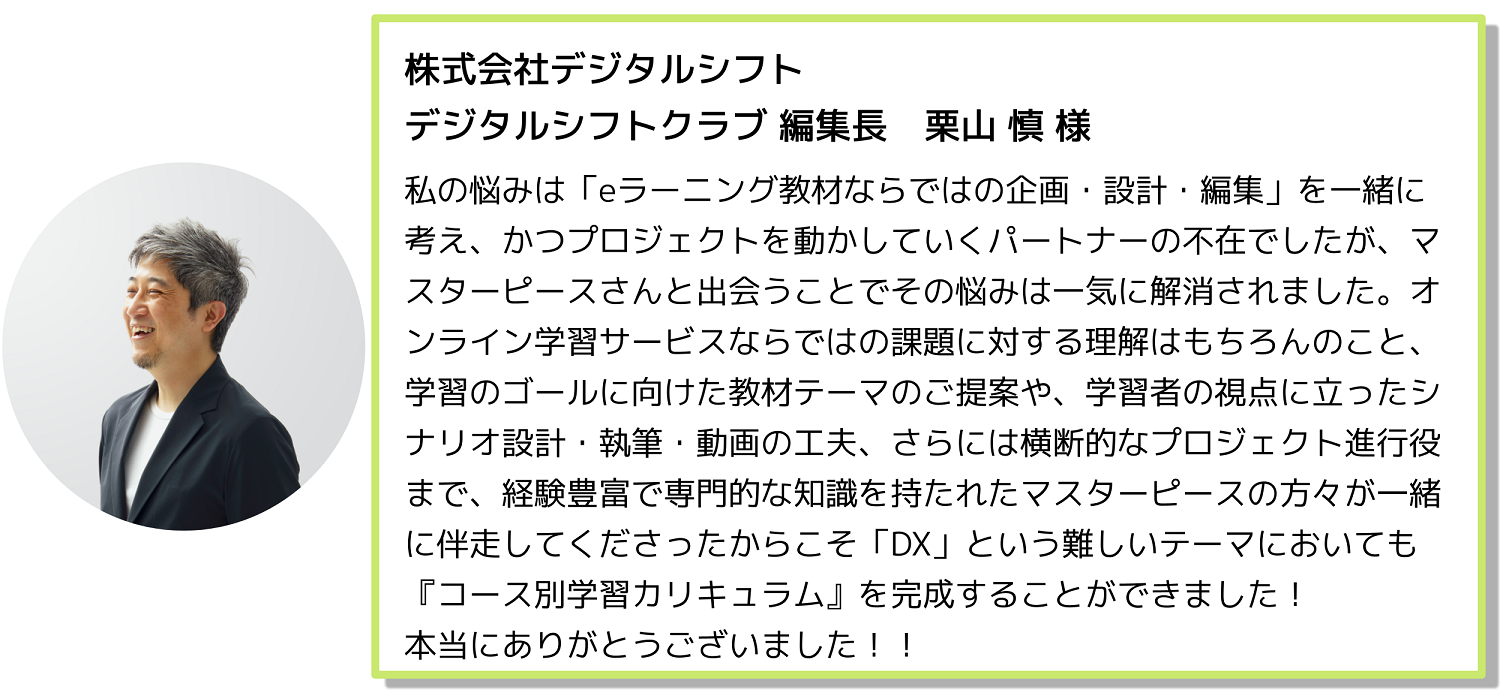 企業のデジタルシフトを強力に推進する会員制・実践型サービス『デジタルシフトクラブ』上にて、DX推進を体系的に学ぶための新たな「6つのコース別学習カリキュラム」を開講すべく、「6つのコース別学習カリキュラム」の動画制作および学習の到達度を測るための「理解度テスト」「修了テスト」の制作をご一緒させていただきました。