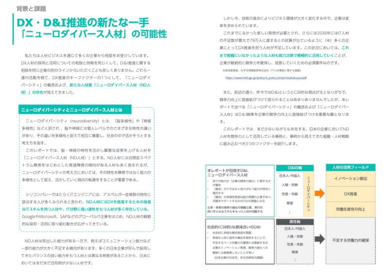 今回のレポートは、多くの企業が企業競争力向上のための経営戦略として取り組むDX推進に関し、その新たな鍵として「ニューロダイバース人材」の戦略的活用に関する提言をまとめたものです。