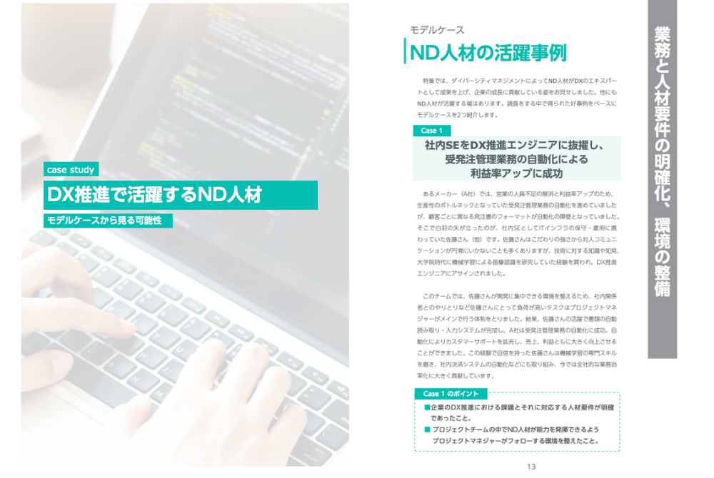 ニューロダイバース人材(ND人材)の能力が事業貢献に結びついている事例やモデルケースを紹介しています。すでに積極的に採用を行っている企業の事例を紹介することによって理解しやすいレポートにまとめています。
